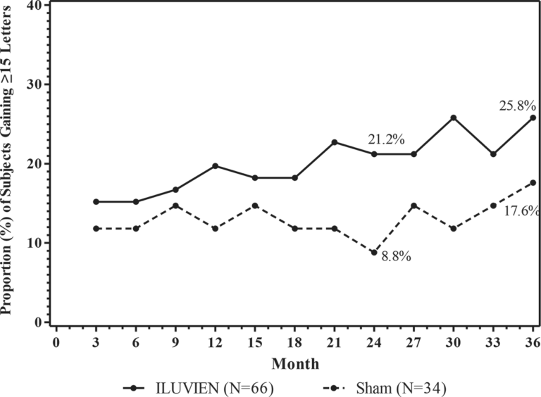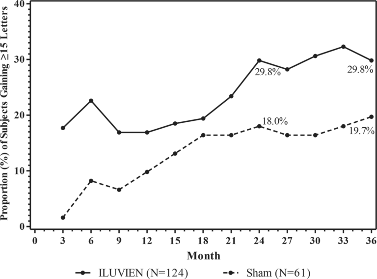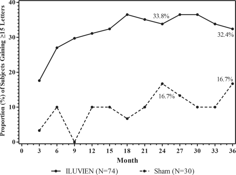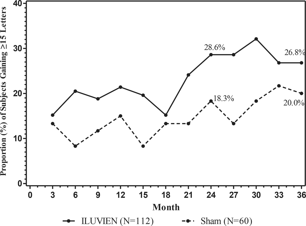 At baseline, 235 of the 375 ILUVIEN subjects were phakic; 121 of 185 sham-controlled subjects were phakic. The incidence of cataract development in patients who had a phakic study eye was higher in the ILUVIEN group (82%) compared with Sham (50%). The median time of cataract being reported as an adverse event was approximately 12 months in the ILUVIEN group and 19 months in the Sham group. Among these patients, 80% of ILUVIEN subjects vs. 27% of sham-controlled subjects underwent cataract surgery, generally within the first 18 months (Median Month 15 for both ILUVIEN group and for Sham) of the studies.