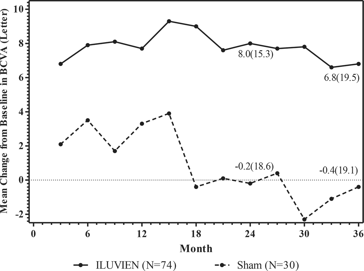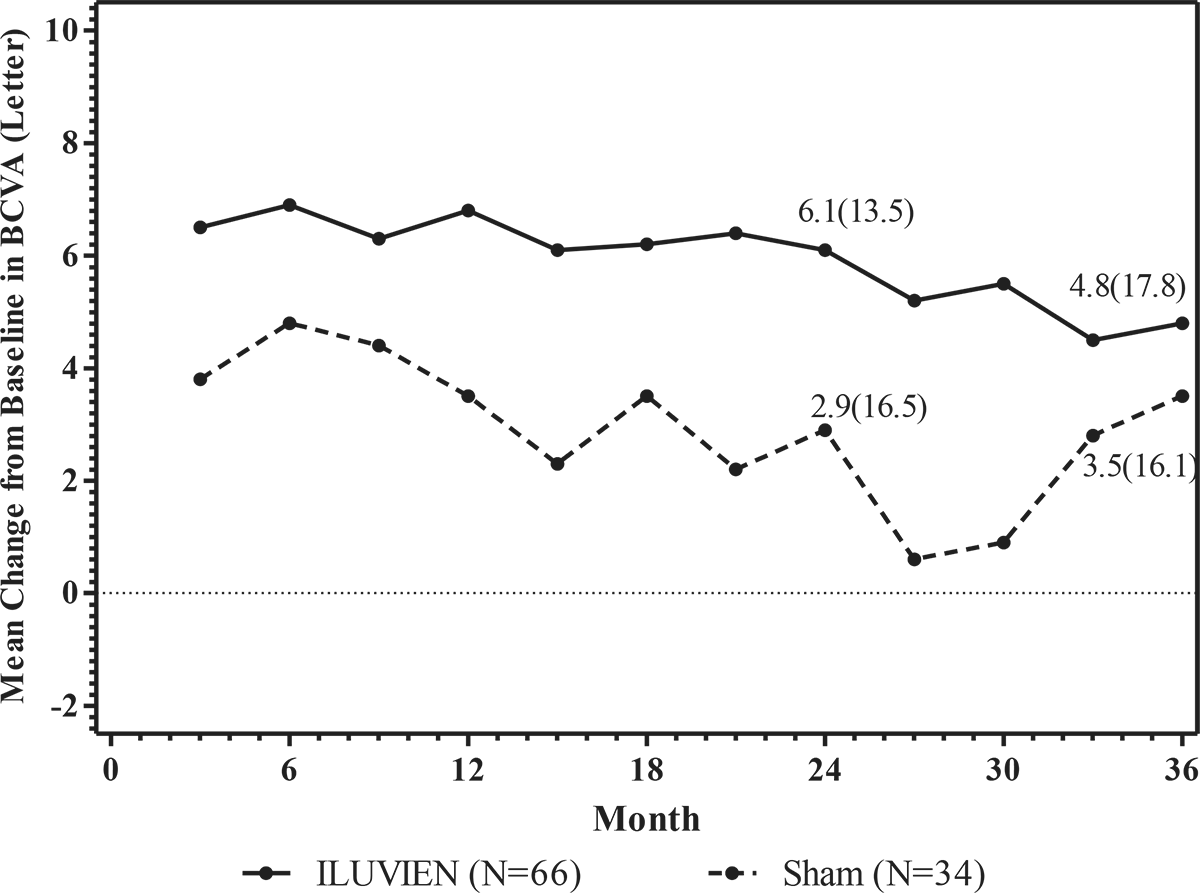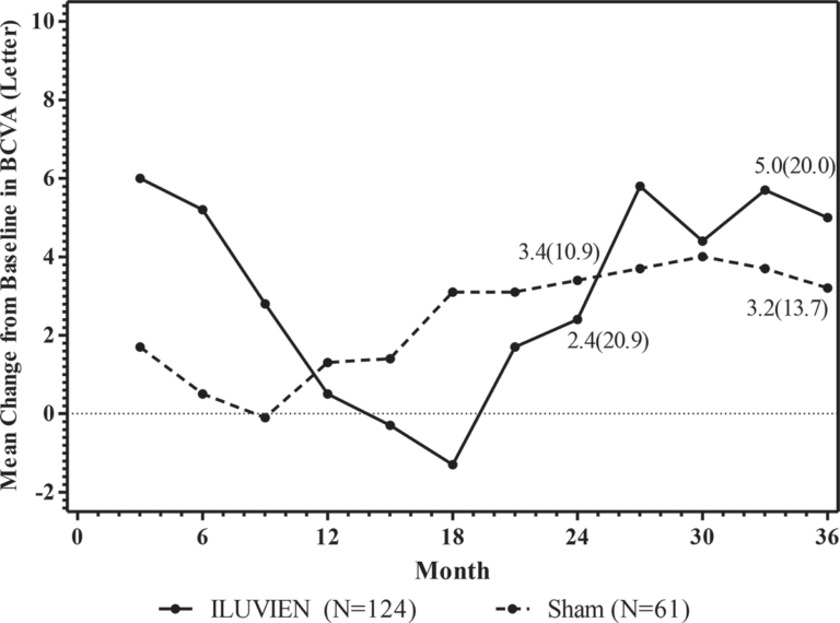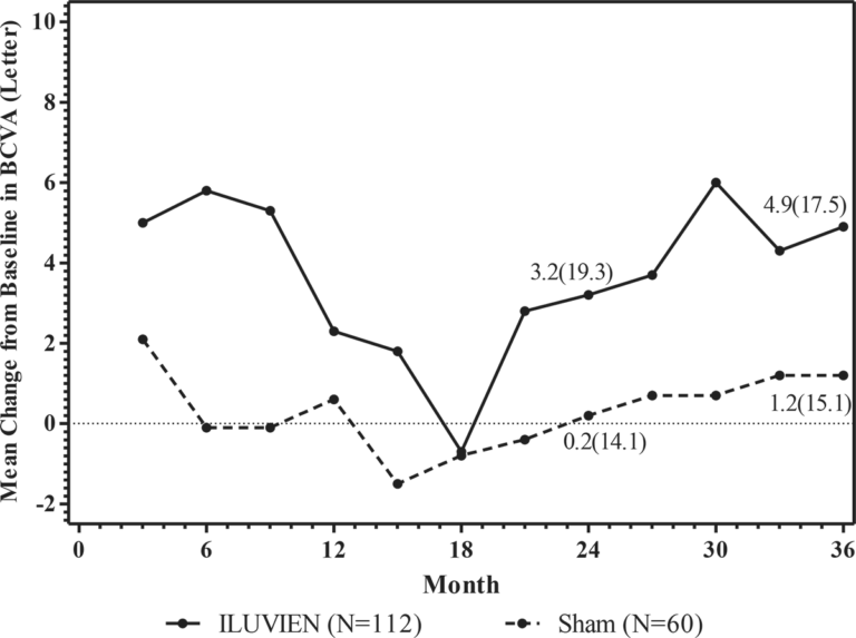 ILUVIEN was studied in two multicenter, randomized, sham-controlled, masked trials in which patients with diabetic macular edema (DME) were treated with either ILUVIEN (n=375) or sham (n=185).
