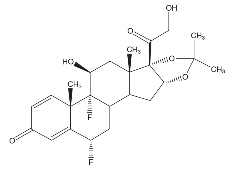 The chemical name for fluocinolone acetonide is (6α,11β,16α)-6,9-difluoro-11,21-dihydroxy-16,17-[(1-methylethylidene)bis-(oxy)]-pregna-1,4-diene-3,20-dione. Its chemical structure is: