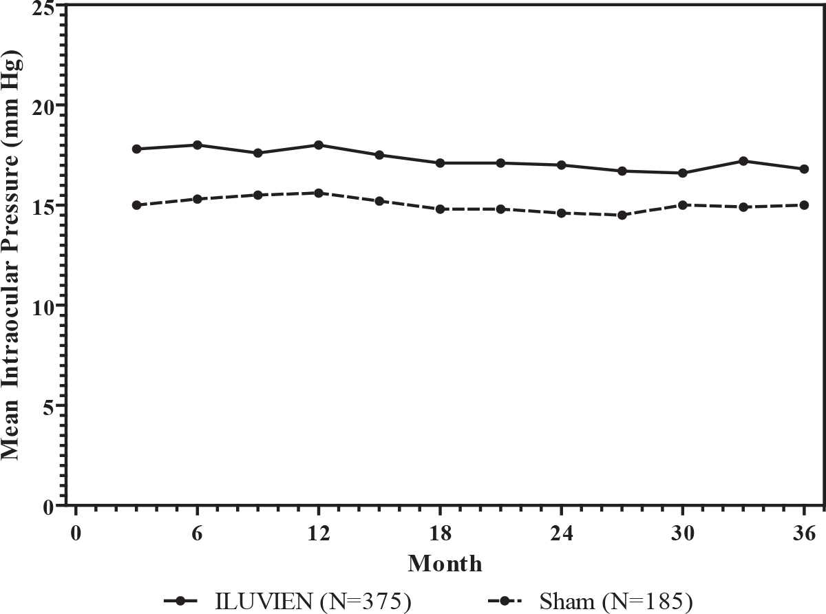 Increased Intraocular Pressure: IOP elevation greater than or equal to 10 mm Hg from baseline at any visit was seen in 34% of ILUVIEN patients versus 10% of sham patients. IOP elevation greater than or equal to 30 mm Hg was seen in 20% of ILUVIEN patients versus 4% of sham patients. 38% of the patients who received ILUVIEN were subsequently treated with IOP-lowering medications during the study versus 14% of sham patients. 5% of the patients who received ILUVIEN needed surgical intervention for elevated IOP versus 1% of sham patients